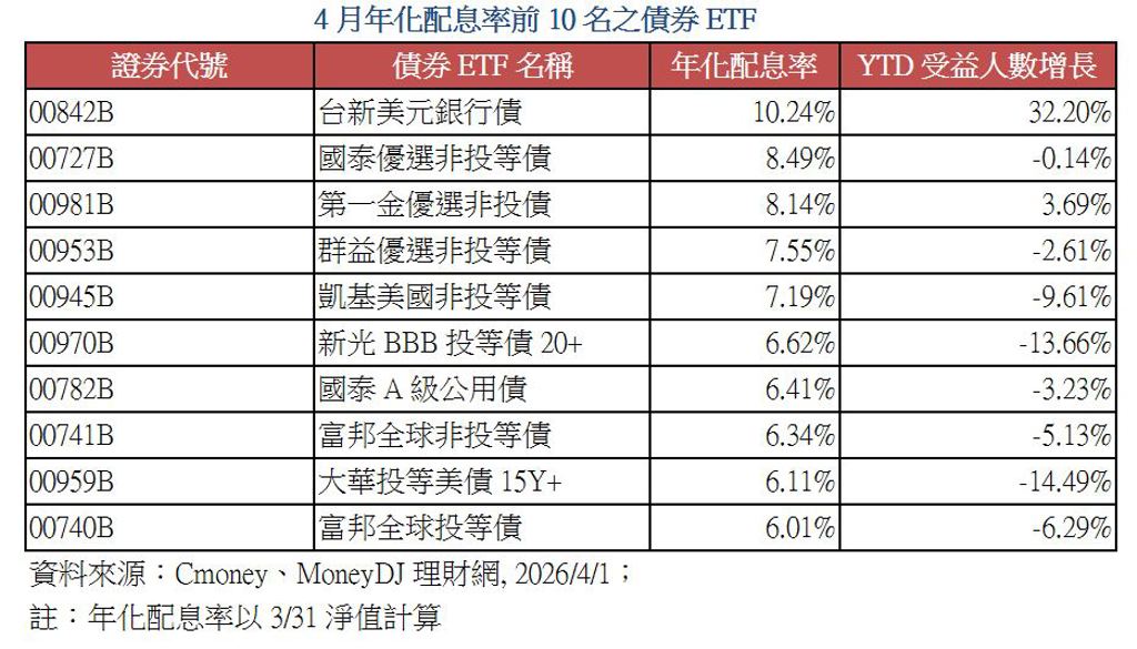 4月份進入債券ETF除息旺季,據目前已公布配息的債券ETF資料顯示,4月份除息之債券ETF年化配息率前十強之配息率皆達6%以上,其中前三強台新美元銀行債(00842B)、國泰優選非投等債(00727B)、第一金優選非投債(00981B)年化配息率皆逾8%,台新美元銀行債(00842B)是唯一年化配息...