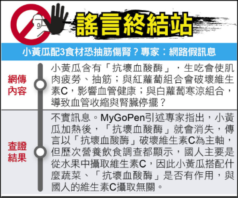 網傳內容:小黃瓜含有「抗壞血酸酶」,生吃會使肌肉疲勞、抽筋;與紅蘿蔔組合會破壞維生素C,影響血管健康;與白蘿蔔寒涼組合,導致血管收縮與腎臟停擺?查證結果:不實訊息。MyGoPen引述專家指出,小黃瓜加熱後,「抗壞血酸酶」就會消失,傳言以「抗壞血酸酶」破壞維生素C為主軸,但歷次營養飲食調查都顯示,國人主要是從水果中攝取維生素C,因此小黃瓜搭配什麼蔬菜、「抗壞血酸酶」是否有作用,與國人的維生素C攝取無關。