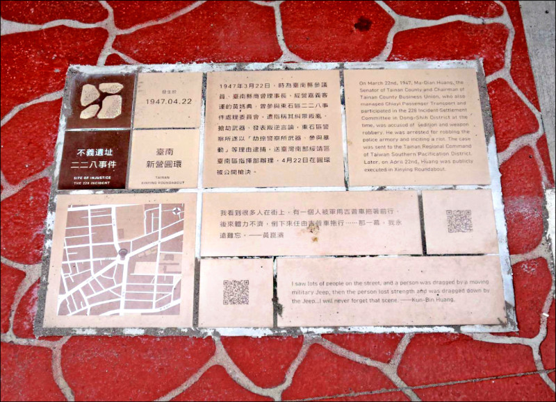 企劃「風裡的時間」系列活動 採藝術參與方式 深化認識人權歷史場址新營仕紳黃媽典在二二八事件後遭當局以參與暴動等理由逮捕,在未經正當審判下於新營圓環公開槍決,二〇二二年公告新營圓環為不義遺址,南市文化局去年底完成標示設置,本月卅一日起舉辦走讀歷史等活動,以藝術教育方式深化大眾對不義遺址及轉型正義議題的認識。