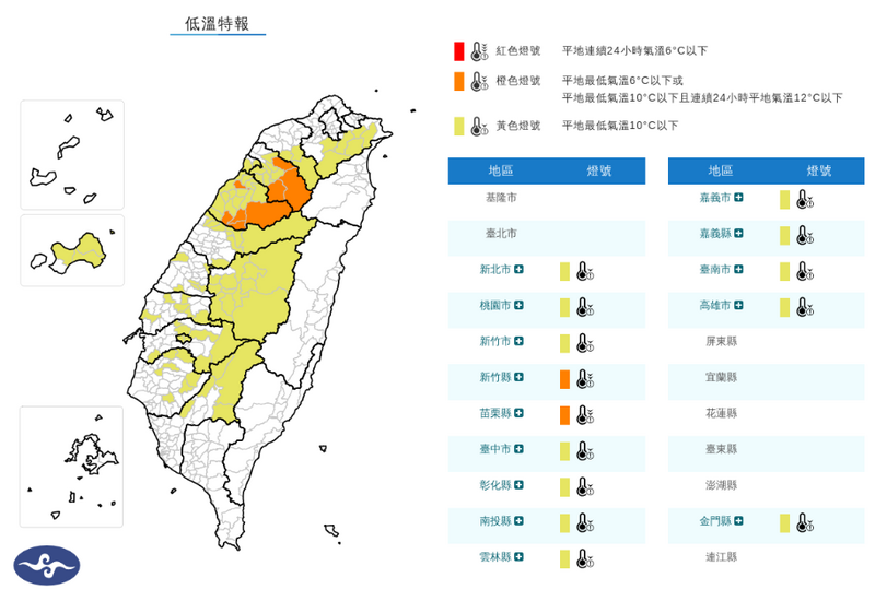 中央氣象署已針對14縣市發布低溫特報,今天(14日)清晨至上午高雄以北及金門有局部10度以下氣溫發生的機率;新竹及苗栗則有局部6度以下氣溫發生的機率。氣象署今天清晨4時38分發布低溫特報稱,大陸冷氣團及輻射冷卻影響,各地早晚偏冷。新竹縣、苗栗縣有6度以下氣溫發生的機率,為橙色燈號(非常寒冷);新北市、桃園市、新竹市、台中市、彰化縣、南投縣、雲林縣、嘉義市、嘉義縣、台南市、高雄市、金門縣有10度以下氣溫發生的機率,為黃色燈號(寒冷)。