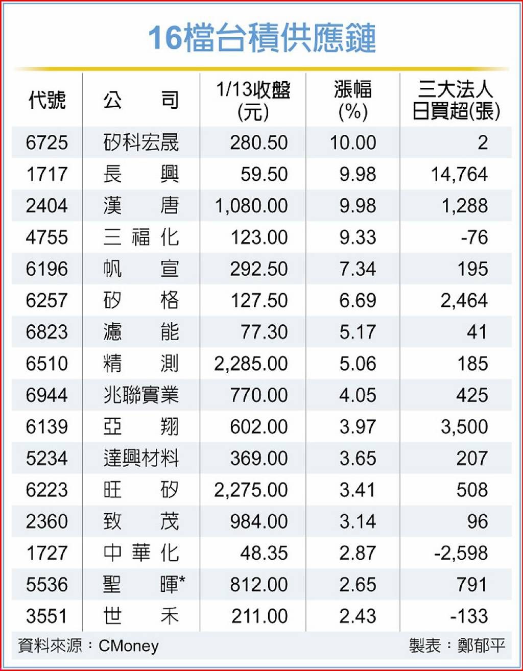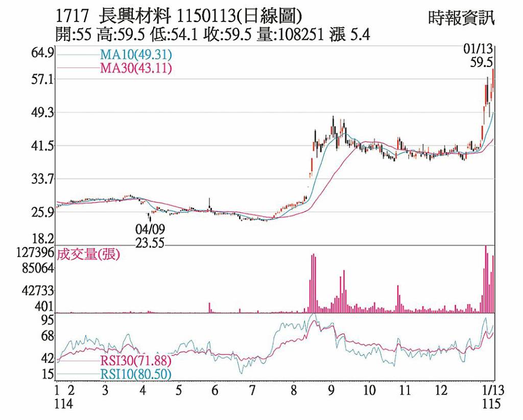長興(1717)因高階半導體材料貢獻發酵,加上持股7成子公司長廣將於16日掛牌上市,13日隨特定買進駐拉抬,強勢亮燈漲停,以59.5元收盤,創波段高點,成交張數10.77萬張,比前一日增加40%,其中外資買超近1.4萬張。股價連二漲,合計漲幅15.76%,突破55.7元壓力,多空量能強勢向上。 20...