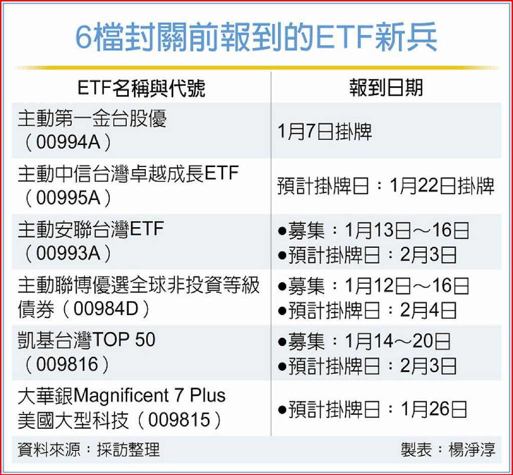 2025年總計45檔ETF掛牌,2026年元月起已有主動第一金台股優(00994A)領先7日掛牌上市,封關之前還有主動中信台灣卓越成長ETF(00995A)、主動安聯台灣ETF(00993A)等多檔ETF將掛牌,合計金蛇年尾有6檔ETF新兵將陸續報到,其中多檔為台股ETF,有望為台股挹注資金活水。 ...