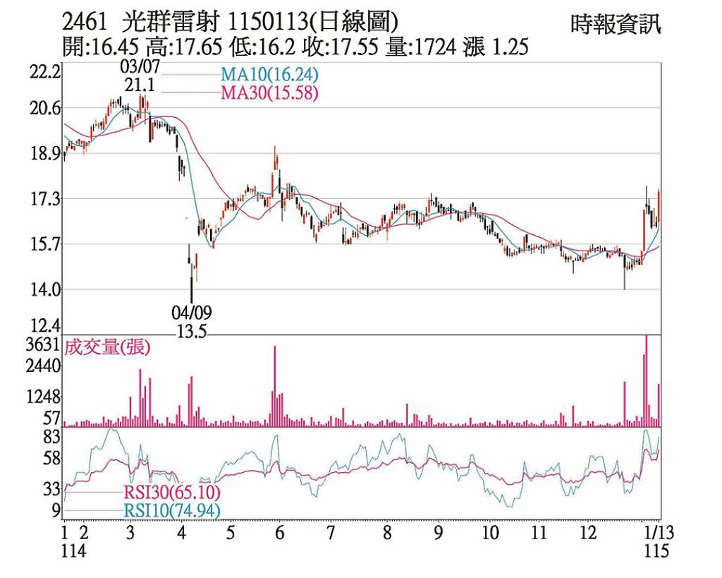 雷射全像材料整合供應商光群雷(2461)13日股價帶量大漲,午盤後大單敲進,終場以大漲7.67%作收,收盤價17.55元,成交量1,715張,為近五日新高。 光群雷因雷射防偽產品具特殊性,本業表現穩定,且新廠投產費用增加,加上匯兌損失衝擊,2025年前三季獲利下滑,每股淨損約0.32元。惟12月營收...
