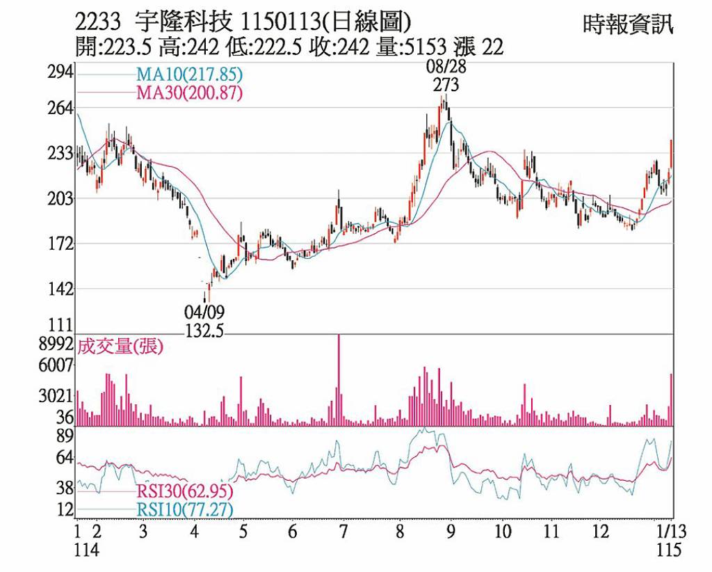 宇隆(2233)受惠於機器人題材,加上切入輝達GB300伺服器液冷系統關鍵元件UQD供應鏈,激勵13日股價開高走高,上午11時50分首度攻上漲停價,隨即漲停打開,下午12時7分再度攻上漲停價,之後上下震盪整理,直至下午12時53分,漲停鎖死至終場,收242元,站上近四個月來新高,成交量5,152張。...