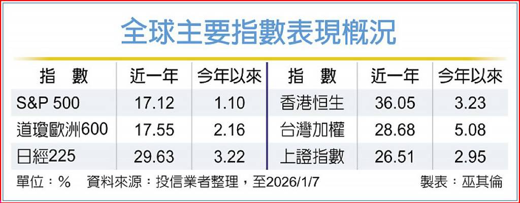 全球股市2026年開年延續去年漲勢,普遍走揚。法人指出,美股、歐股、亞太地區及新興市場在2025年均繳出雙位數報酬率,但估值已顯偏高,股市波動度可能加大,可考慮布局具靈活性的主動式基金,以達到攻守兼備的效果。 瀚亞環球智慧數據股息基金經理人賴盈良表示,美國通膨率預計維持在3%左右或以上,受消費疲軟影...