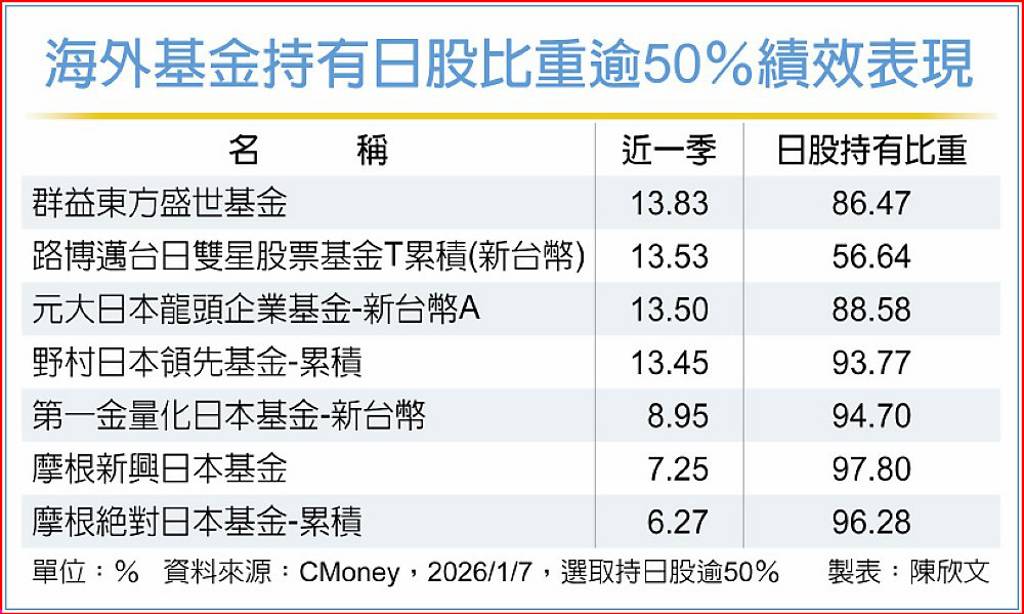 2025年下半年以來受惠AI議題持續發酵、企業獲利提升,及日本新首相高市早苗推出財政刺激政策等利多驅動,帶領日本股市寫新高,2026年仍延續氣勢,連帶日本布局比重高的海外股票基金,表現跟著吃香,統計日股持有比重超過5成的海外股票基金有7檔,近一季、近一年都繳出亮眼佳績。 群益投信日本股票研究團隊指出...