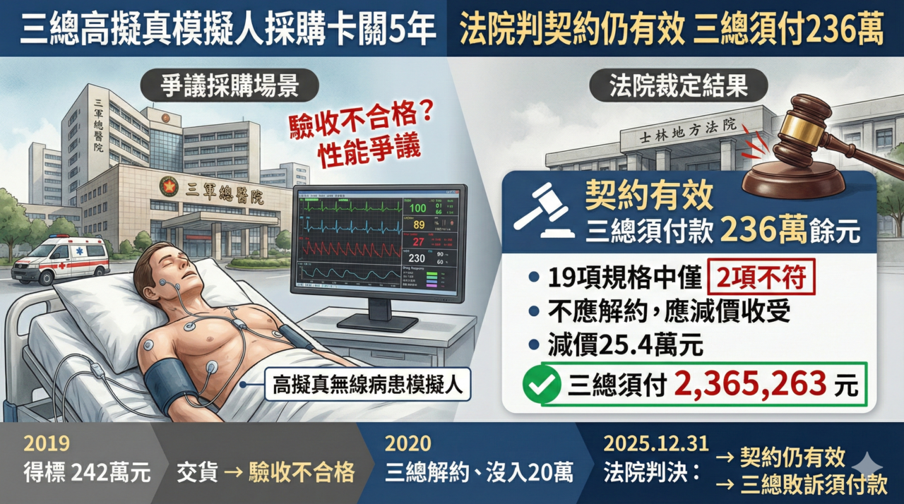 國防醫學院三軍總醫院(下稱三總)採購「無線病患高擬真模擬人教學模型」爆發履約爭議。得標廠商格林科技有限公司不滿三總以「性能測試不合格」為由,單方面解除契約並沒收20萬保證金,憤而提告。雙方纏訟5年,士林地院認定採購契約關係仍存在,僅部分功能有瑕疵,判三總應給付格林科技236萬5263元。