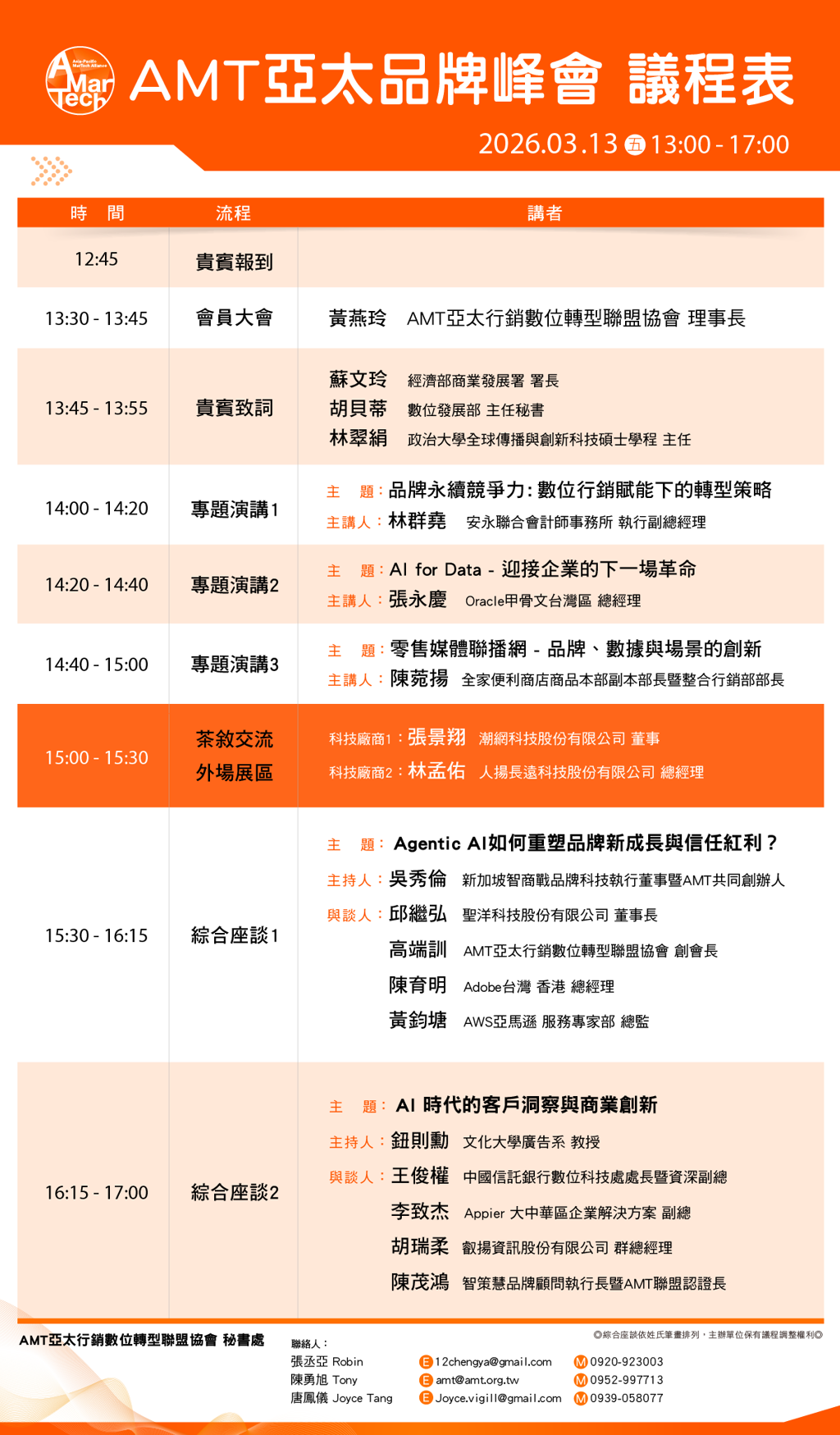 隨著生成式 AI 從技術議題邁向商業實踐,台灣企業正迎來「智慧升級」的黃金跨越期。由 AMT 亞太行銷數位轉型聯盟協會 主辦的「2026 AMT 亞太品牌峰會」將於 3 月 13 日政大公企中心國際會議廳盛大舉行。本次盛會不僅