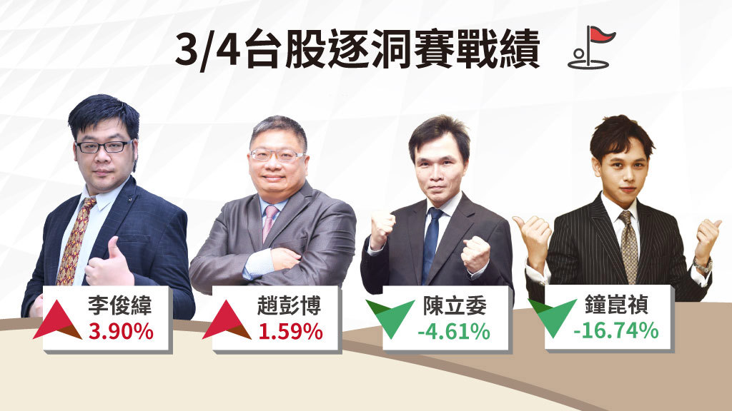 0304逐洞賽投組表現: 達發(6526)漲1.90%:逆勢小漲的強勢股,具備光通訊與低軌衛星雙題材。 正基(6546) 跌9.44%:獲利了結賣壓正式出籠,爆大量長黑。 元晶(6443) 跌8.36%:今日再收一根黑K,使得近三日的K線呈現假突破型態。 尼德科超眾 (6230)跌6.94%:再次留...