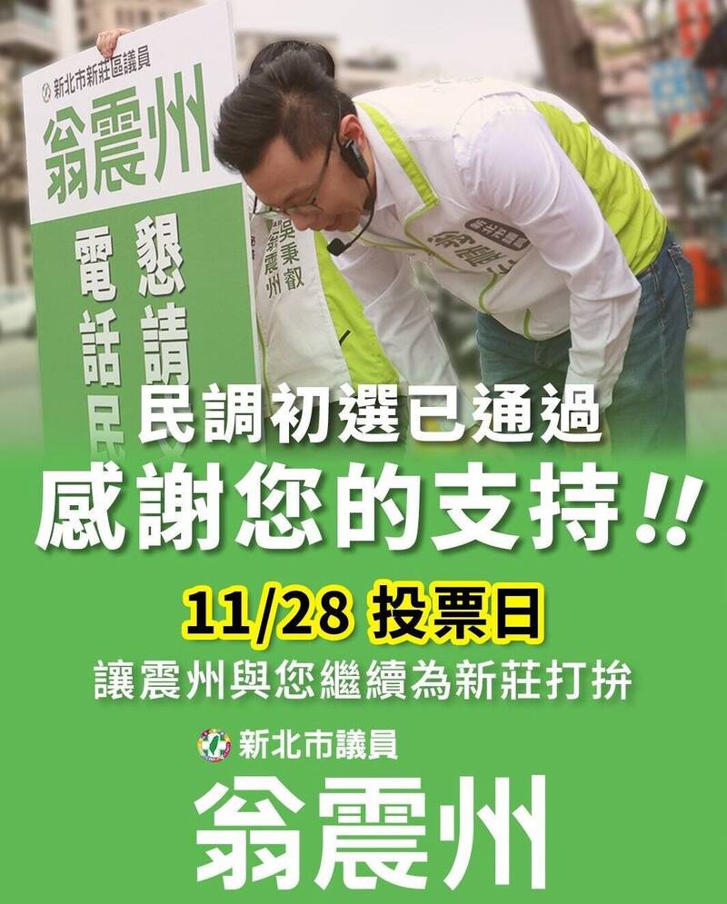 民進黨新北市議員第3選區(新莊區)初選民調,5搶4含女性保障1席,結果今(24)日出爐,新人陳岱吟、吳奕萱分別位居第一、第二,其後依序為現任市議員林秉宥、翁震州,4人出線;林秉宥、翁震州兩人皆感謝鄉親的支持,接下來11月28日的大選,仍需大家相挺支持、繼續努力。根據民進黨中央黨部今天公布的民調結果,前立法院長游錫堃辦公室副主任陳岱吟以0.2641拿下第一,吳思瑤子弟兵吳奕萱以0.2120居次,其後依序為林秉宥0.1856、翁震州0.1847;前議員陳科名辦公室主任翁昭仁以0.1536排名第五,未通過初選門檻。