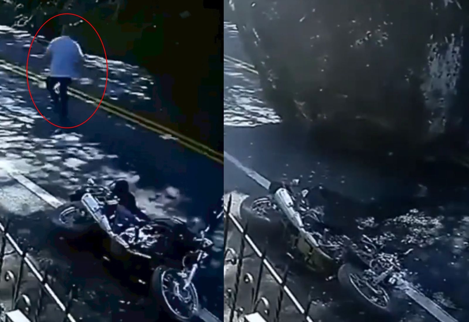 哥倫比亞安蒂奧基亞省達貝巴(Dabeiba)市區日前發生一起驚悚意外,一名機車騎士才剛停好車,山坡上突然傳出轟然巨響,一顆巨石如流星般墜落,瞬間將機車砸成廢鐵。所幸騎士反應迅速,在巨石落下前死命奔跑,驚險逃過死劫。全程被監視器拍下,在當地社群瘋傳。