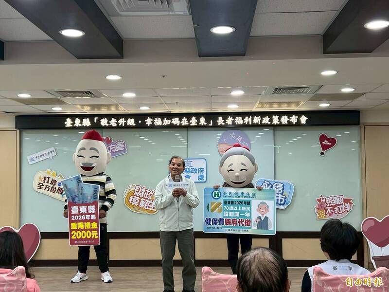台東縣長饒慶鈴宣布,自明年起將推出兩項重大長者福利加碼措施,包括將重陽節敬老禮金由500元提高至2000元,以及縣府將為年滿70歲且設籍台東滿一年之長者代繳健保費自付額。兩項措施將嘉惠全縣超過9成長輩。縣長饒慶鈴強調,全縣65歲以上長者在10月底已達4萬3364人,佔人口比例20.78%,已達到超高齡社會的標準,縣府團隊因此一直朝「在地安老、幸福共老」的方向施政。明年起設籍台東滿1年、年滿70歲以上的長者健保費自付額,將由縣府代繳,減輕長輩們每月的醫療負擔。另外,明年台東縣政府的重陽節敬老禮金,將由原本的500元,加碼為2000元,兩項社福新政策預計投入總經費3億2600萬元。