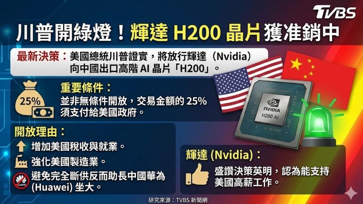 美國總統川普(Donald Trump)本月 8 日透過自家社群 Truth Social 宣布,核准輝達(Nvidia)將「H200 晶片」銷往中國。作為條件之一,輝達需將其中 25% 利潤上繳美國政府,白宮官員透露,這筆分潤金將以進口稅的方式向其生產地台灣收取。