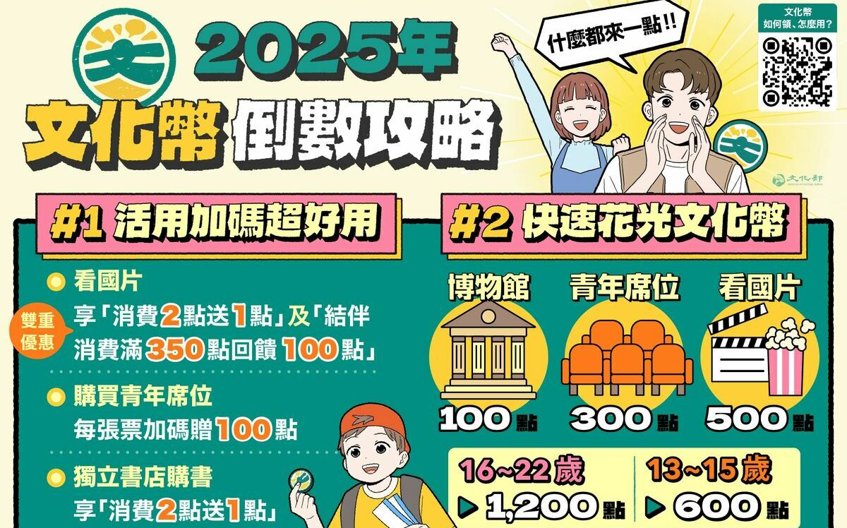 最後20多天倒數!2025年文化幣將在12月31日到期,邁入文化部今(9)日提醒,還沒領取使用的青年,儘快至文化幣APP領用,並分析大數據提供達人使用秘訣,推薦兩大使用攻略,「趕快花光!今年的文化幣不要省,因為明年的文化幣,20多天後又即將入袋」。2025年文化幣自1月起發放,已有逾165萬人領取,