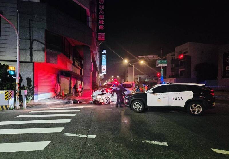 台南市四分局育平派出所員警,26日凌晨5時10分許,於安平區發現一輛自小客車違規紅燈右轉,警方上前欲攔查,未料該車拒檢加速竄逃,並失控自撞路旁民宅牆壁及鐵捲門後才停車,造成自小客車前車頭嚴重毀損,民宅鐵捲門及牆壁亦受損,46歲沈姓駕駛頭部受創,肋骨骨折送醫救治,沈男酒測值高達0.85mg/l,將依公共危險等罪嫌送辦。