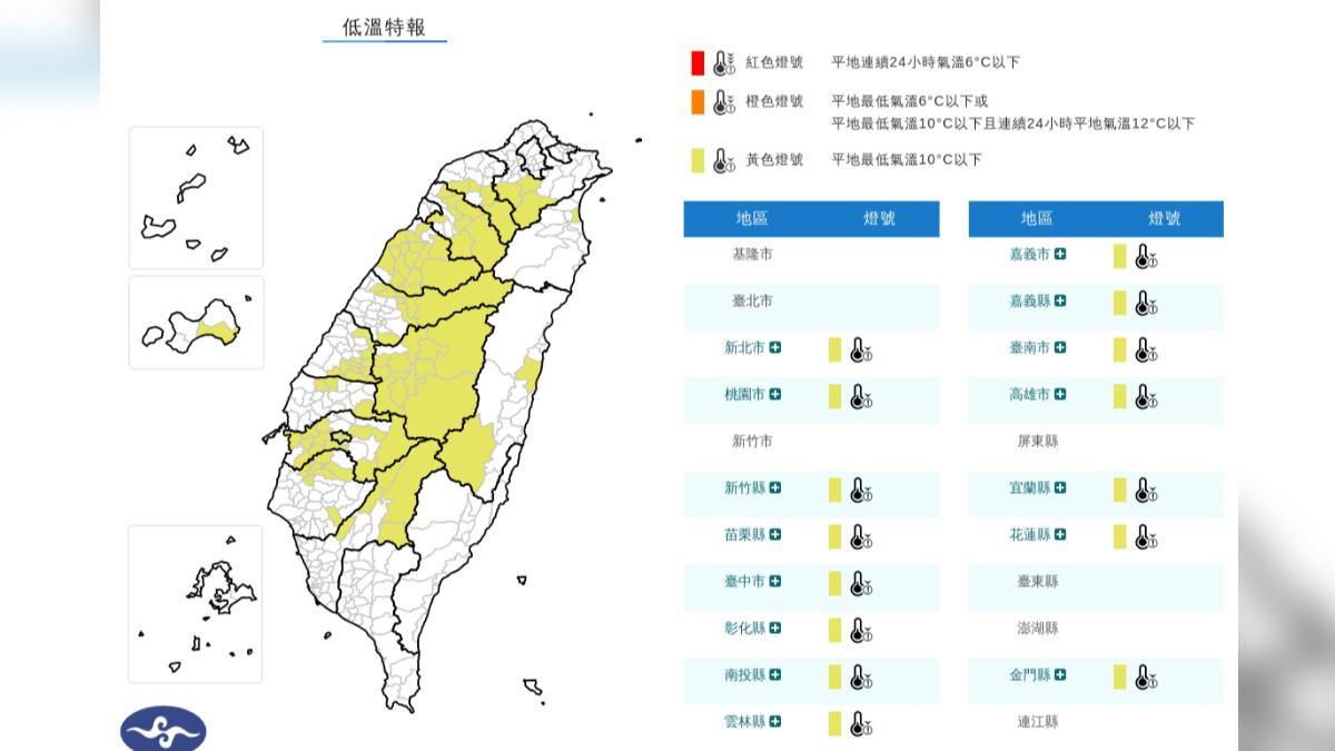 中央氣象署今(4日)晚上10時31分針對15縣市發布低溫特報,因輻射冷卻影響,各地氣溫明顯偏低,明(5日)晨至上午局部地區有10度以下氣溫(黃色燈號)發生的機率,請注意。