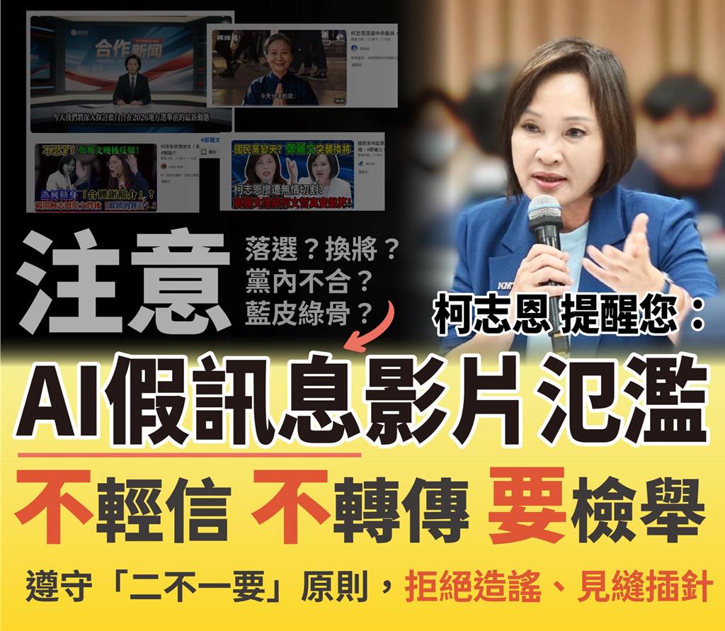 民國115年地方大選步步逼近,藍綠白各方陣營陸續展開布局,日前國民黨確定徵召立委柯志恩參選高雄市長,不過,近日網路上卻流傳「柯志恩落選國民黨中央委員」、「柯志恩討好綠營」等影片,對此,國民黨高市黨部發聲
