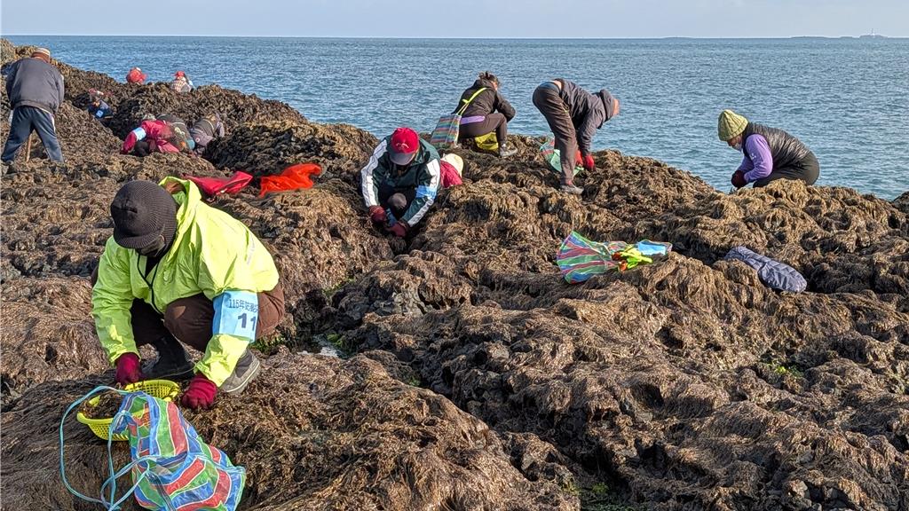 澎湖姑婆嶼挽採野生紫菜盛會5日上午登場,260位民眾趁著5日風浪轉小,強烈冷氣團南下前難得好天氣,分乘5艘快艇,從白沙鄉赤崁碼頭浩浩蕩蕩前往船程30分鐘外的姑婆嶼登島,採收有「黑金」之稱的紫菜。由於今年冬天老