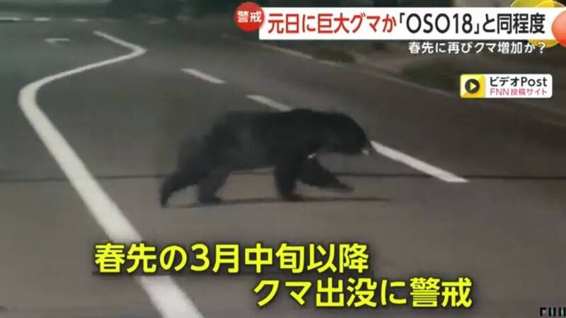 原本應該進入冬眠季節的時期,但在年末年初,熊出沒的事件仍接連發生。對此,岩手大學農學部副教授山內貴義示警,這個冬天,因山中食物不足,許多熊已經開始依賴人類的食物,因此3月中旬以後,勢必進一步加強警戒。《FNN》報導,去年12月25日耶誕節深夜,1輛行駛於宮城縣內的計程車行駛過程中,突然有隻熊衝到車前,司機稱這隻熊大概有1.5公尺高;12月30日跨年前夕,1隻熊闖入營業中的溫泉旅館設施內,滯留約5小時後,被相關單位實施緊急獵殺;今年元旦當天,在北海道厚岸町,有民眾散步時發現疑似熊的足,根據發現的足跡判斷,其體型被認為與2023 年曾襲擊乳牛並遭到撲殺的巨大熊「OSO18」相當,警方已呼籲居民提高警戒。
