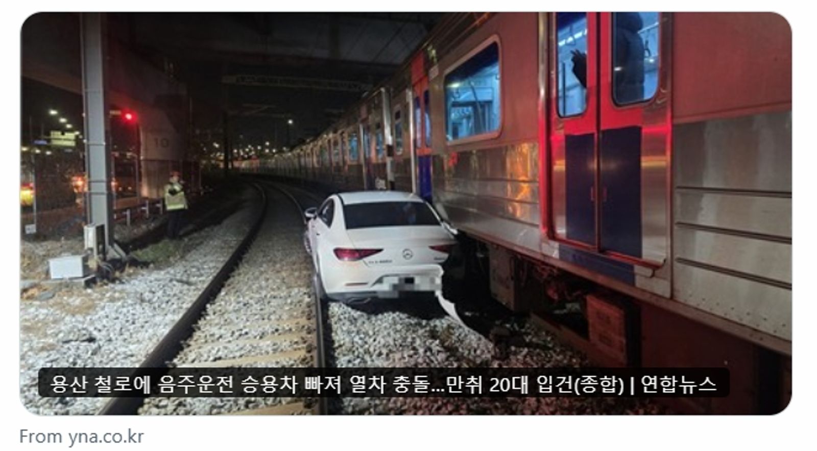 南韓首爾龍山區昨晚發生一輛酒駕事故,1名20多歲女子醉酒駕車撞上西冰庫站與京義中央線列車相撞,導致31名乘客被迫疏散。女子血中酒精濃度超過吊銷駕照標準的0.08%,警方對其採取不拘留立案。
