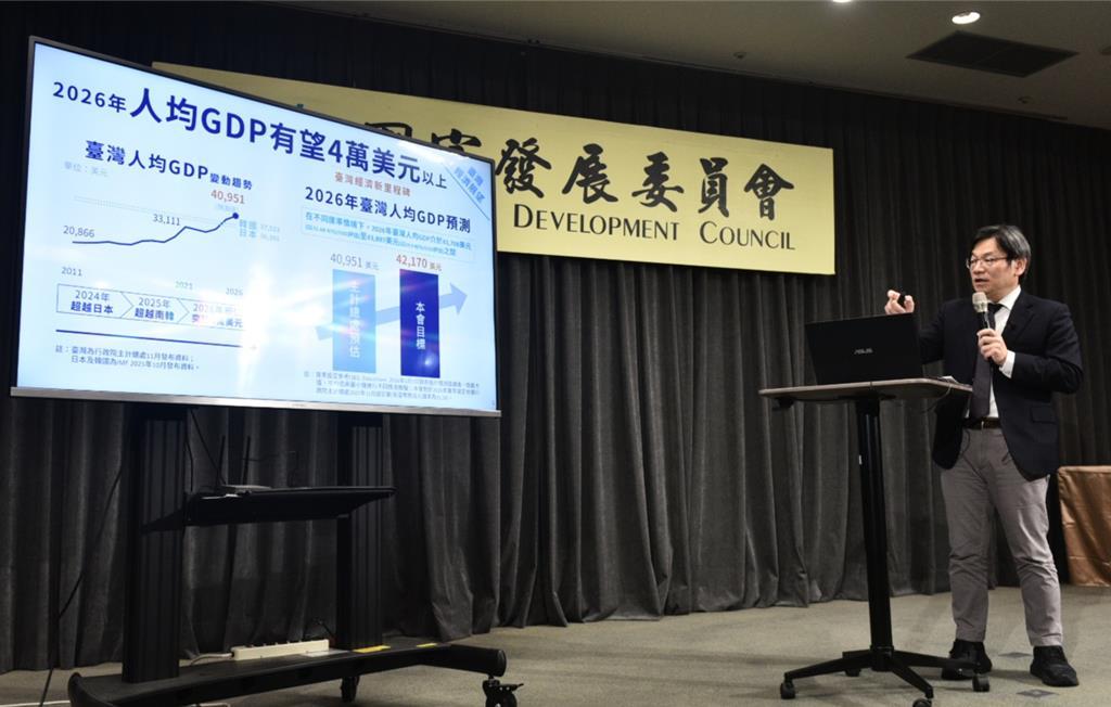 國發會今(3)日上午舉辦年終記者會,國發會主委葉俊顯表示,2026年台灣預估在振興民間消費、公共支出增加、帶動民間投資,以及淨輸出成長等4大助力之下,國發會目標今...