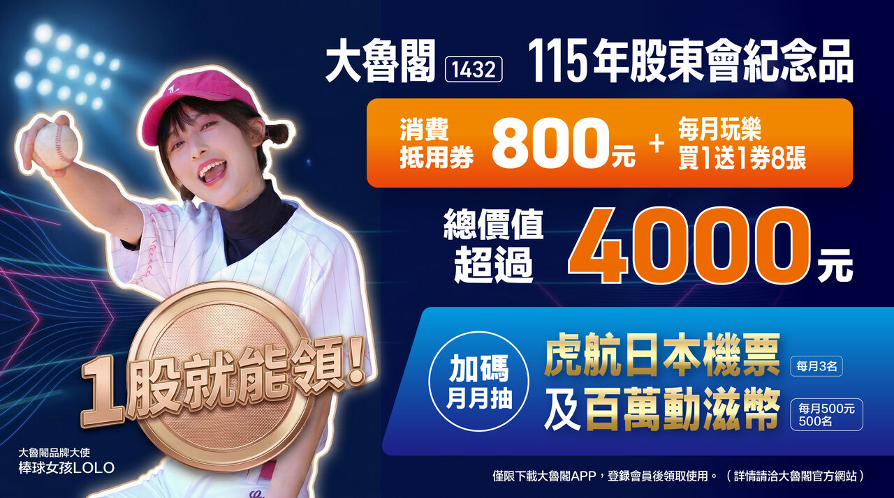 大魯閣 (1432)今(11)日宣布今年股東會紀念品發放方案,透過官方APP「大魯閣 Plus」提供股東包含800元消費抵用券及8張「每月玩樂買1送1券」,總價值超過4200元,只要持有1股就能領。不過要在3月26日前持股,才符合領取資格。