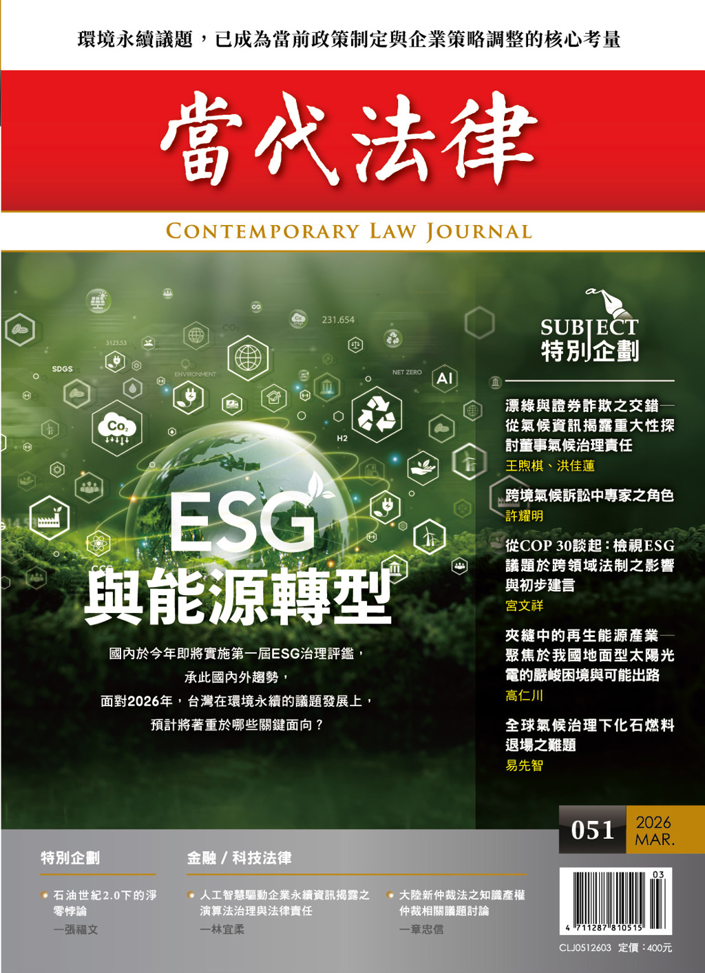 當期《當代法律》專題【ESG與能源轉型】議題,邀請學者及專家:東吳大學學術交流長王煦棋教授與洪佳蓮以〈漂綠與證券詐欺之交錯──從氣候資訊揭露重大性探討董事氣候治理責任〉;國立政治大學法學院教授許耀明以〈跨境氣候訴訟中專家之角色〉;東吳大學法學院副教授宮文祥以〈從COP 30談起:檢視ESG議題於跨領...