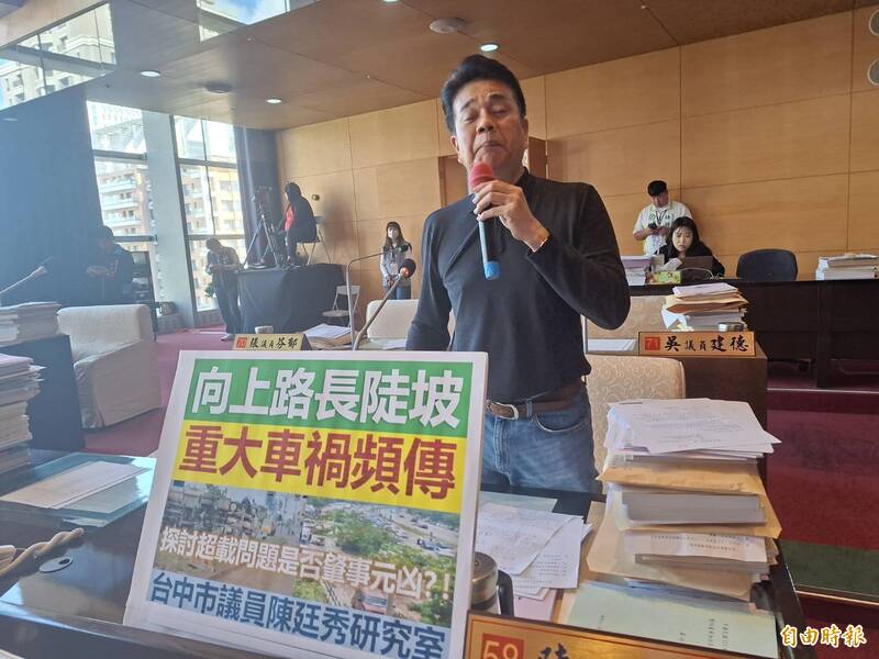 台中市議會今天進行市府總預算的二讀會大體討論,市議員陳廷秀表示,向上路六、七段有區段測試,但還是常發生車禍,他認為是過重、超載所造成,要求警察局在該處加地磅,減少車禍;警察局長吳敬田則表示,車禍的因素是多元,不是單一因素。市議員陳廷秀今天在市議會指出,指向上路六、七段老是發生車禍,他認為是過重、超載所造成,但是有人認為是區段測試才是元兇,但他認為超載超重才是重要因素,但竟然會被外界出征。