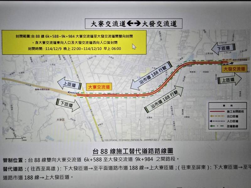 台88線進行橋樑結構安全評估,將於明天(9日)晚上10點到隔日(10日)上午6點止,進行交通管制辦理現地車輛載重試驗,將雙向封閉台88線6K+588大寮交流道至9K+984大發交流道間路段交通管制,往返高屏地區的駕駛人注意改道通行。公路局南區養護工程分局指出,台88管制時間駕駛請改道,從屏東往西至高雄,由大發交流道下匝道,至平面道路市道 188 線,再由大寮交流道上匝道回台88線行駛,由高雄往東至屏東,則由大寮交流道下匝道,至平面道路市道 188線,再由大發交流道上匝道入台88線行駛。