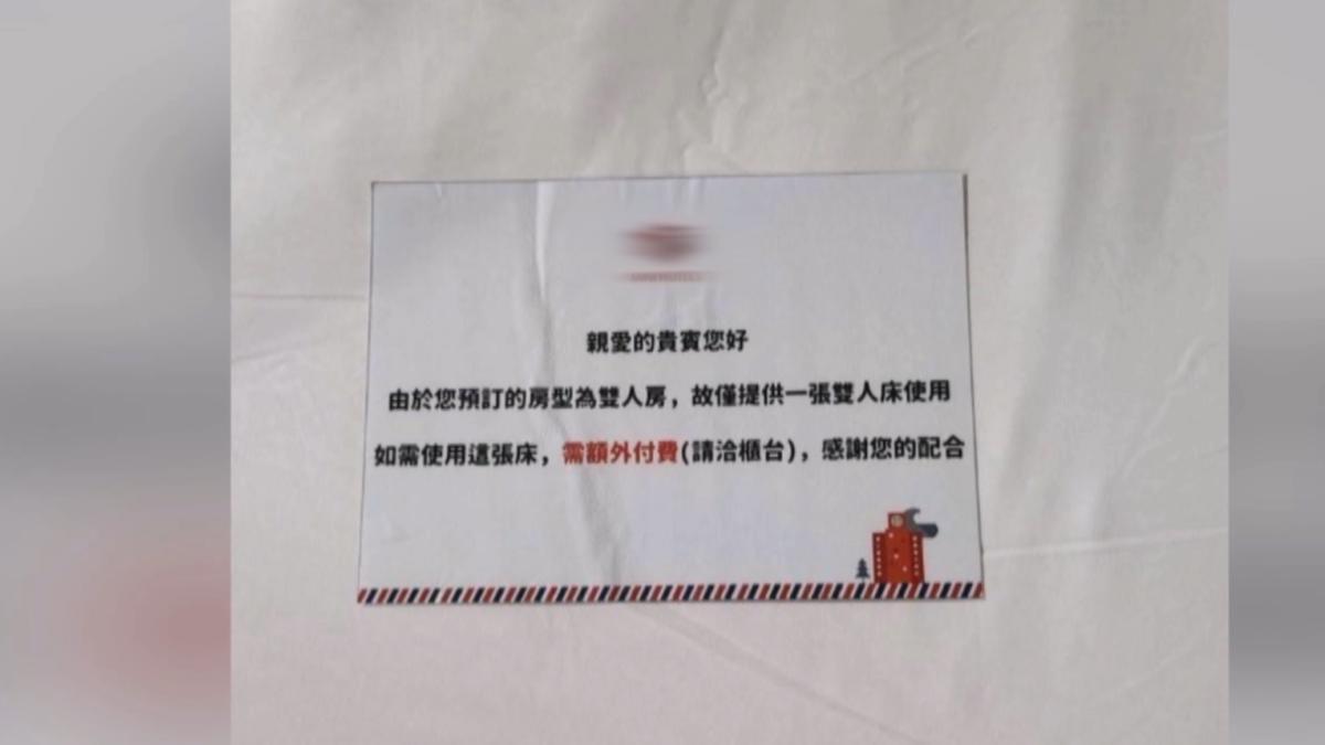 有民眾到台中逢甲大學附近旅店住宿,提早預訂雙人房卻疑似因房間不足被安排入住四人房,但床上竟放紙條提醒只能使用一張床,若使用另一張須額外付費!消費體驗大打折扣,讓當事人傻眼上網詢問是否合理,引發熱議。