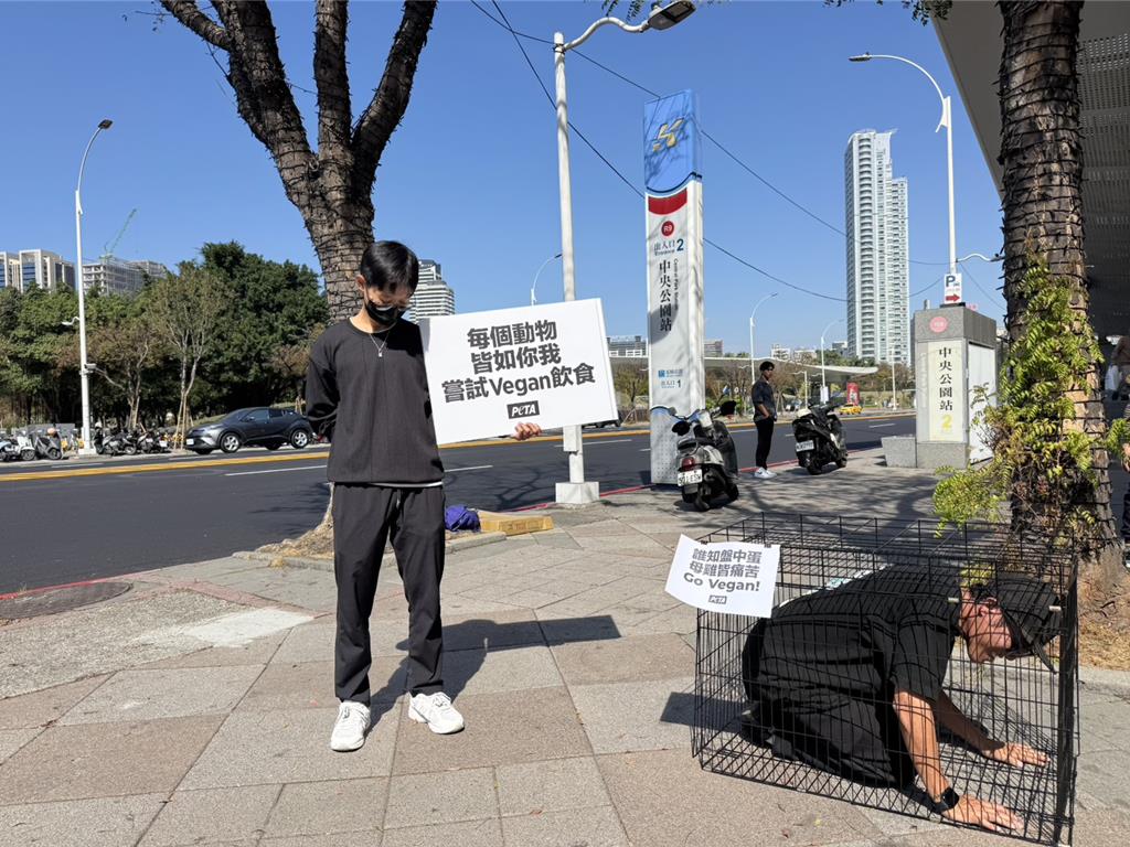 善待動物組織(PETA)5日在高雄中央公園捷運站出口外舉辦「體驗母雞的一生」行動,透過模擬蛋雞飼養環境,邀請民眾親身走入籠子,感受母雞日復一日被限制行動、無法伸展翅膀與轉身困難的生存處境。現場設置的體驗籠