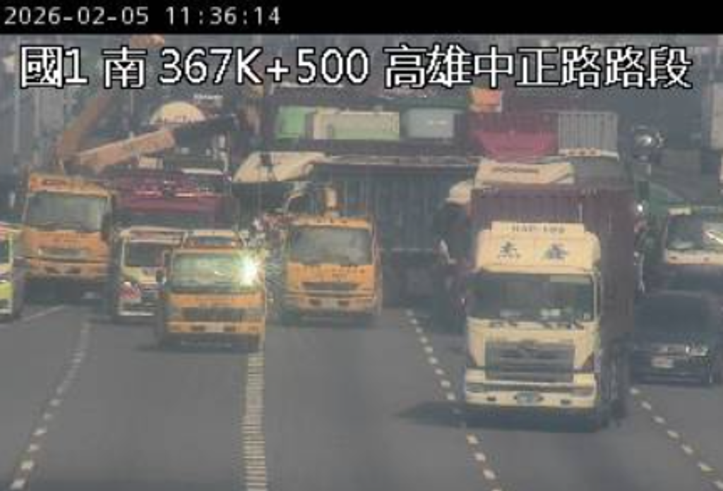 國道一號南向367公里處高雄中正路段,今(5)日上午11時5分發生一起連環車禍,拖板車、砂石車、貨櫃車不明原因在此撞成一團,現場占用中間與外側車道,後方車陣已回堵約5公里,相關單位已趕至現場處理。提醒將行經該
