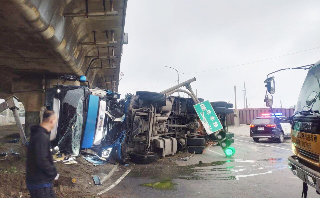 台61線桃園觀音南下路段,今(24)日清晨5時許發生聯結車失控擦撞左轉自小客車後翻覆,路口號誌桿也遭撞斷,大園警方獲報後封閉南下車道處理,肇事的聯結車陳姓駕駛與自小客車駕駛都受到擦挫傷,酒測值均為零,警方引導車流改道繞行,至於肇事原因仍待後續調查釐清,事故現場已於上午9時30分許排除恢復通行。