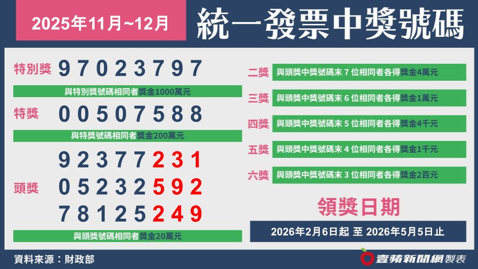 115年1、2月期統一發票即將在25日開獎,財政部表示,114年期11、12月統一發票千萬特別獎,中獎號碼「97023797」中獎張數17張,有7張未領。包含中華電信基隆營運處所開出通話費173元;台北市內湖舊宗路上好市多所開出