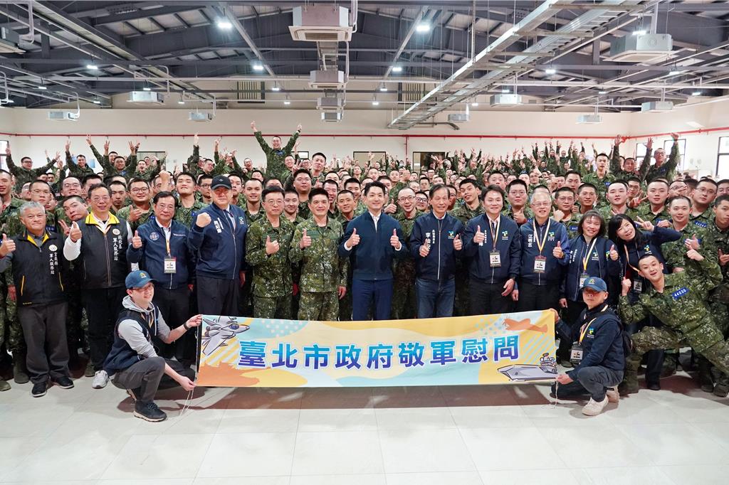 農曆春節即將到來,台北市長蔣萬安14日下午率兵役局長李治安等市府團隊,在北市軍人服務站長吳遠里的陪同下前往宜蘭金六結營區,慰問目前服役中的陸軍常備兵役軍事訓練第248、251梯次及補充兵第438梯次,共計650名台