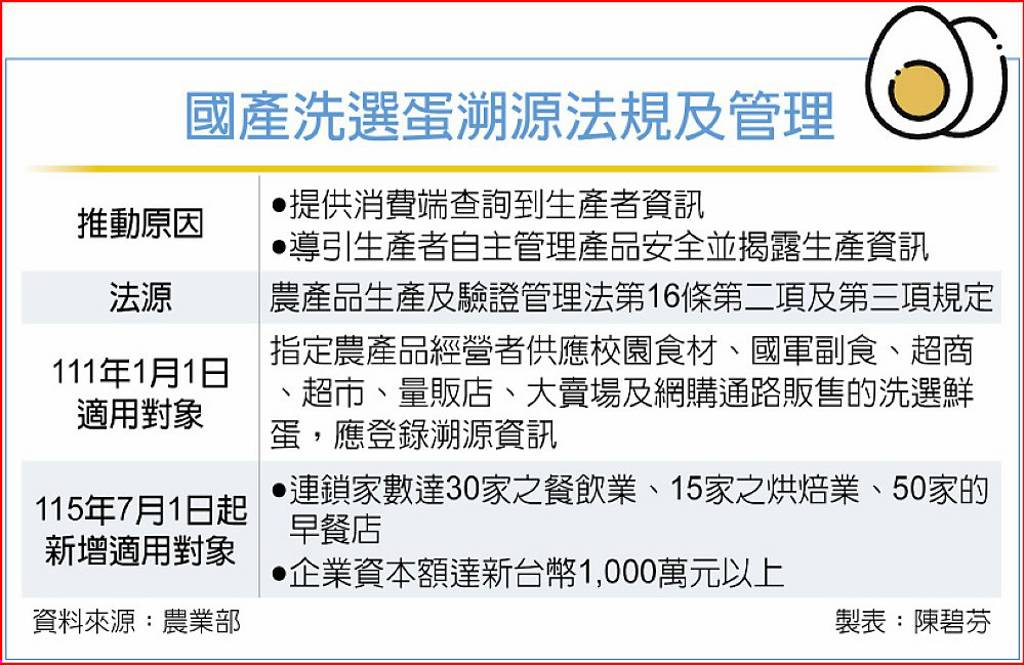為阻絕餐飲業者找理由無端漲價,農業部3日提醒,自7月1日起實施國產洗選蛋溯源制度修正,業者須逐顆噴印及溯源登錄,主要針對「一定規模」以上的早餐店、烘焙店、餐飲店等業者。凡合乎:一、連鎖家數達30家以上餐飲業、15家以上烘焙業、50家以上早餐店,二、企業資本額達新台幣1,000萬元以上等條件的業者都適...