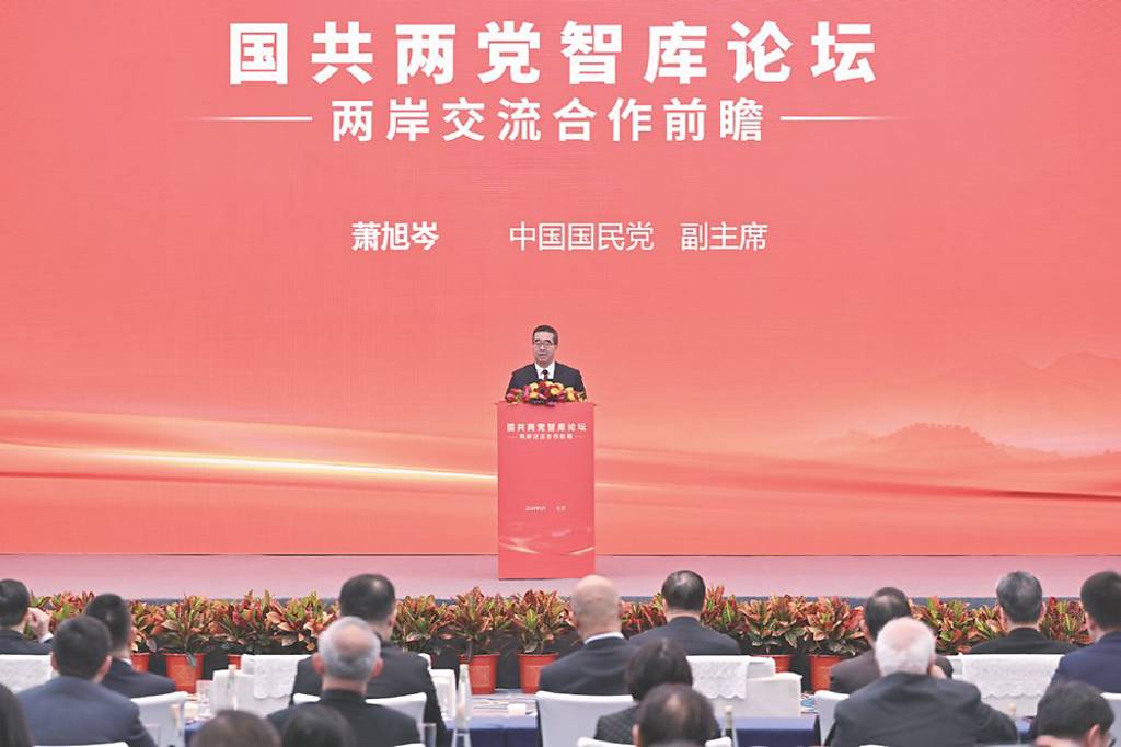 國共兩黨智庫論壇3日在北京登場,國民黨副主席蕭旭岑率隊前往北京出席活動。國台辦主任宋濤致詞表示,兩黨要毫不動搖堅持「九二共識」、反對「台獨」共同政治基礎。論壇並就五大方面達成「共同意見」,包括推動恢復兩岸人員往來正常化等。 論壇主題為「兩岸交流合作前瞻」,由海峽兩岸關係研究中心與中國國民黨國政研究基...