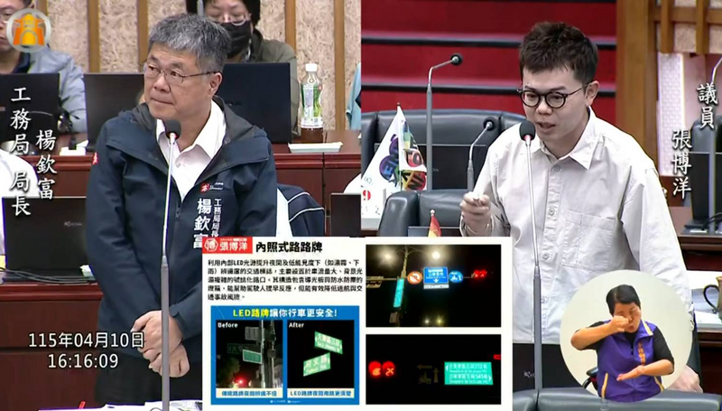 高雄市議員張博洋今天質詢關注共桿路燈路牌,分日、夜秀出多張照片,凸顯路燈路牌「晚間」難以辨識的情況。工務局長楊欽富答詢就一句話,「全面盤點」。張博洋質詢以共桿路燈路牌大體檢為題指出,部分共桿路燈路牌在白天很清楚、但晚上狀況多,包括路牌破損、退色、燈箱亮度分布不均、斑駁掉漆等情況。