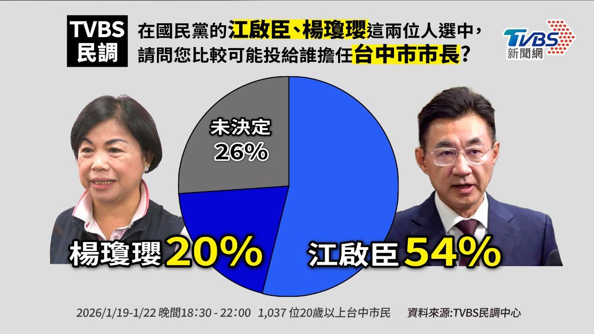 各黨備戰2026選舉,台中市長部分,民進黨已確認由立法委員何欣純參選;國民黨的人選則尚未決定,立法院副院長江啟臣與立法委員楊瓊瓔皆有意參選。江、楊二人16日在國民黨黨中央協調破局,還待第二次協調。根據《TVBS》民調中心今(23)日最新調查結果顯示,黨內互比中,54%台中市民支持江啟臣,20%支持楊瓊瓔,雙方差距34%。