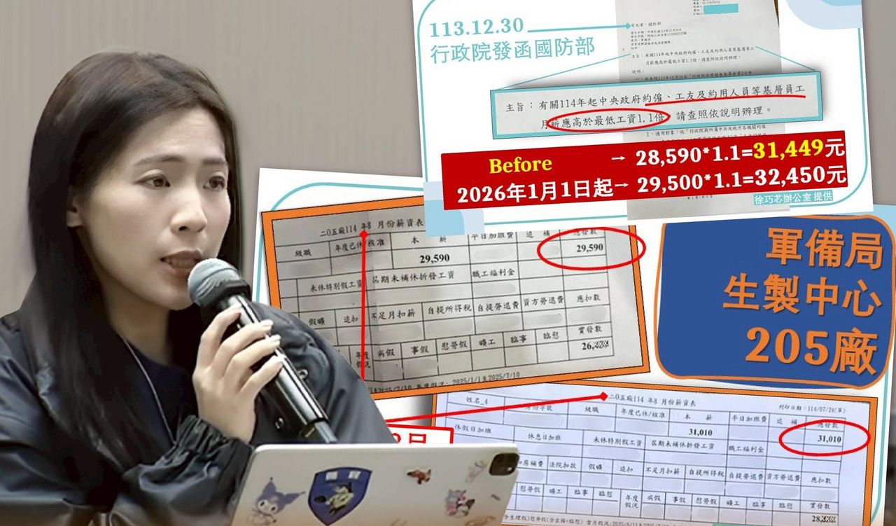 【高沛生/綜合報導】國防部竟成慣老闆?國民黨立委徐巧芯揭露,國防部軍備局轄下兵工廠約聘雇人員薪資,長期低於政府規定的最低標,甚至有員工月薪拿不到3萬元。徐巧芯痛批政府不能帶頭違法,要求國防部全面檢討轄下單位待遇,別讓守護國防產業鏈的基層同仁寒心。