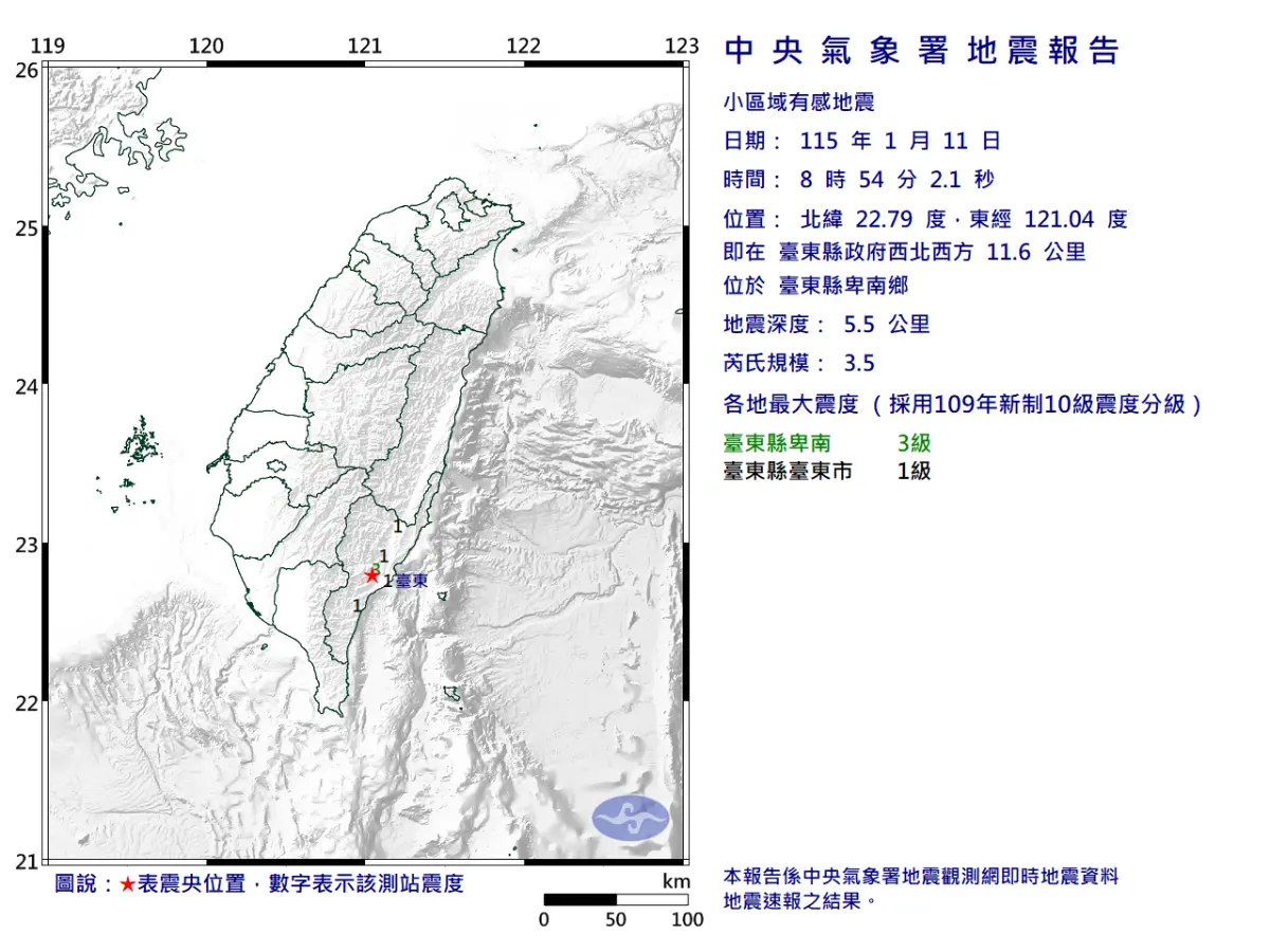 中央氣象署地震測報中心資料表示,今(11)日上午8時54分發生芮氏規模3.5地震,震央位在北緯22.79度,東經121.04度,即在台東縣政府西北西方11.6公里,位於台東縣卑南...