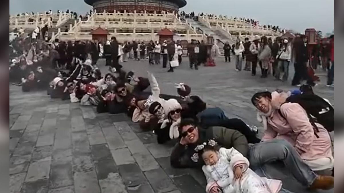 北京天壇公園門口出現有趣一幕!一名男大生考研究所後去天壇旅遊,突發奇想,隨興躺在地上拍照,結果周圍遊客見狀,竟紛紛「秒跟團」加入,形成壯觀的集體躺臥景象,由於畫面太歡樂,迅速在網路爆紅,被稱為「開團秒跟式拍照」,但同時也引發文明遊園的討論。