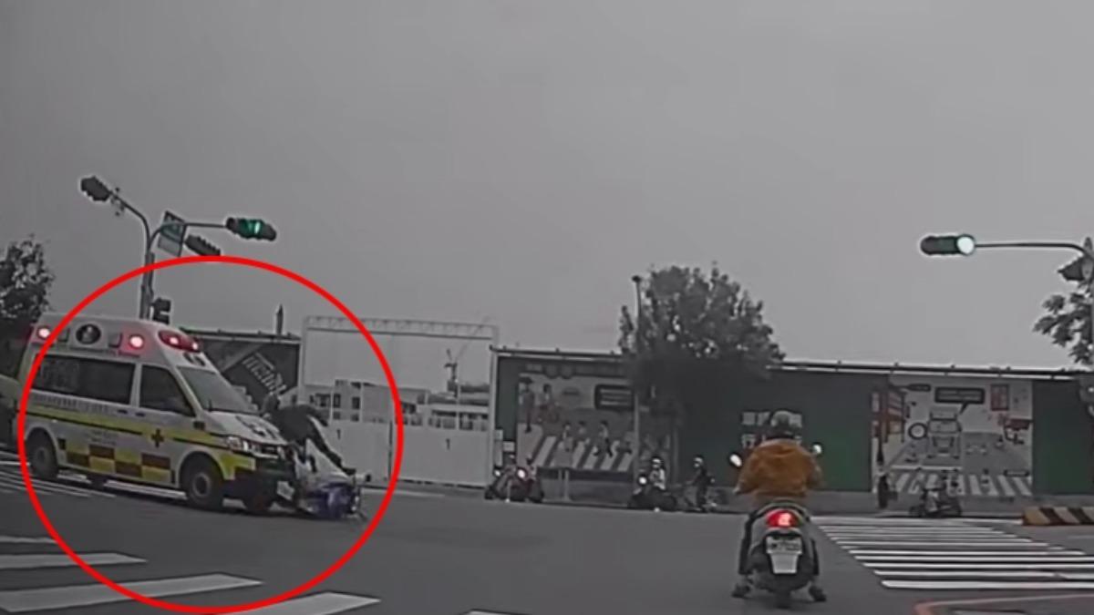 台南永康區一名待轉騎士疑似未聽到鳴笛聲,在路口硬闖遭救護車撞飛倒地,造成身體多處擦挫傷。當時救護車上載有一名95歲已無呼吸心跳的病患正緊急送醫,事故發生後救護人員只能在現場持續進行CPR等待支援!