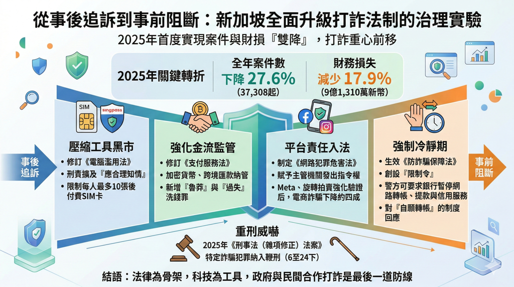 近年來,新加坡面臨前所未有的詐騙壓力。2024 年詐騙案件突破 51,000 起,財務損失超過 11 億新幣,雙雙創下新高。然而,在一系列制度改革與公私協力推動下,2025 年出現關鍵轉折:全年案件數下降 27.6% 至 37,308 起,財務損失亦減少 17.9% 至 9 億 1,310 萬新幣,...