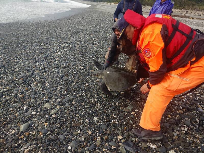 台東縣太麻里鄉三和海域今天上演溫馨的海洋救援行動。海巡署第十巡防區指揮部接獲三和安檢所轉報,當地「三和定置漁場」業者收網時,發現一隻海龜受困,主動通報海巡署協助處理,讓牠重返大海。海巡人員獲報後火速趕赴現場,初步檢視與種類辨識,確認受困海龜是二級保育類「欖蠵龜」。為了確保牠的安全,海巡隊員同步聯繫海保署海洋生物保育組專業人員評估。所幸經專家鑑定,牠健康狀況良好,活動力十足,體型尚未達到需植入金屬標記標準,海巡人員在專業指導下,將牠帶往海邊友善放流,讓這隻珍貴嬌客重返大自然懷抱。