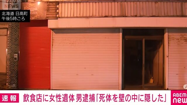 日本北海道日高町1間餐廳的牆壁,今(10日)凌晨被發現1具女性屍體,北海道警方隨即以涉嫌遺棄屍體罪,逮捕49歲的餐廳負責人松倉俊彥,松倉俊彥已向警方承認將遺體藏匿於店內牆壁中。綜合日媒報導,本月1日一名祖母因遲遲無法與20多歲的孫女取得連繫,向警方報案失蹤,警方隨後展開調查,並約談與女子有交集的相關人士,包括松倉俊彥。在接受警方調查過程中,松倉供述涉及藏匿屍體的行為。