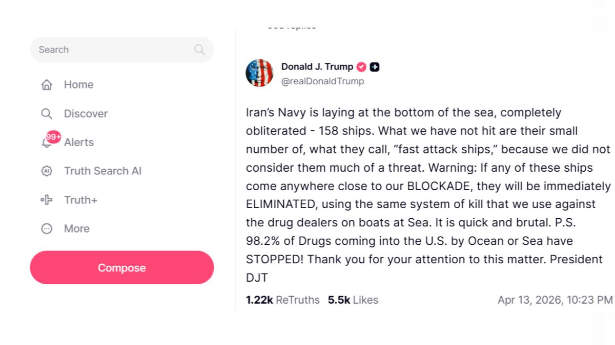 美國總統川普在台灣時間13日晚間就伊朗局勢發表強硬言論,聲稱伊朗海軍「已有158艘船沉入海底、被徹底摧毀」,目前美軍尚未打擊的,僅剩少數伊朗所謂的「快速攻擊艇」。此外按照美軍中央司令部先前宣布的安排,美軍自美東時間4月13日上午10時起,正式對所有進出伊朗港口的海上交通實施封鎖;換算為台灣時間,封鎖自13日晚間10時生效。