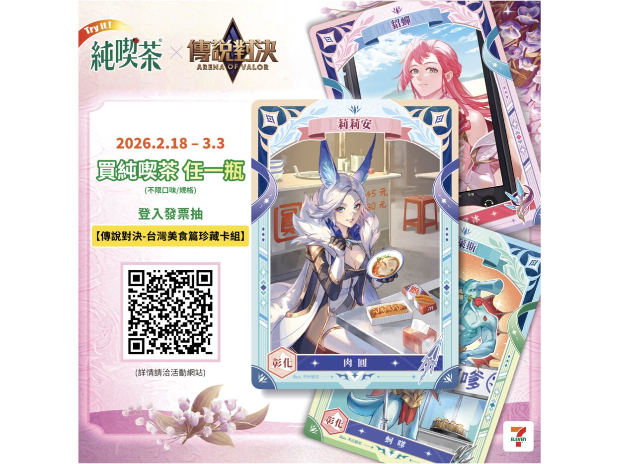 2/18-3/3全台7-ELEVEN門市推出買任一瓶純喫茶就可憑發票抽「傳說對決-台灣美食篇珍藏卡組」活動。這場跨界聯動不只要攻佔玩家的收藏櫃,更要以0-7°C封存的新鮮戰力,陪伴大家贏下每一場關鍵對戰!