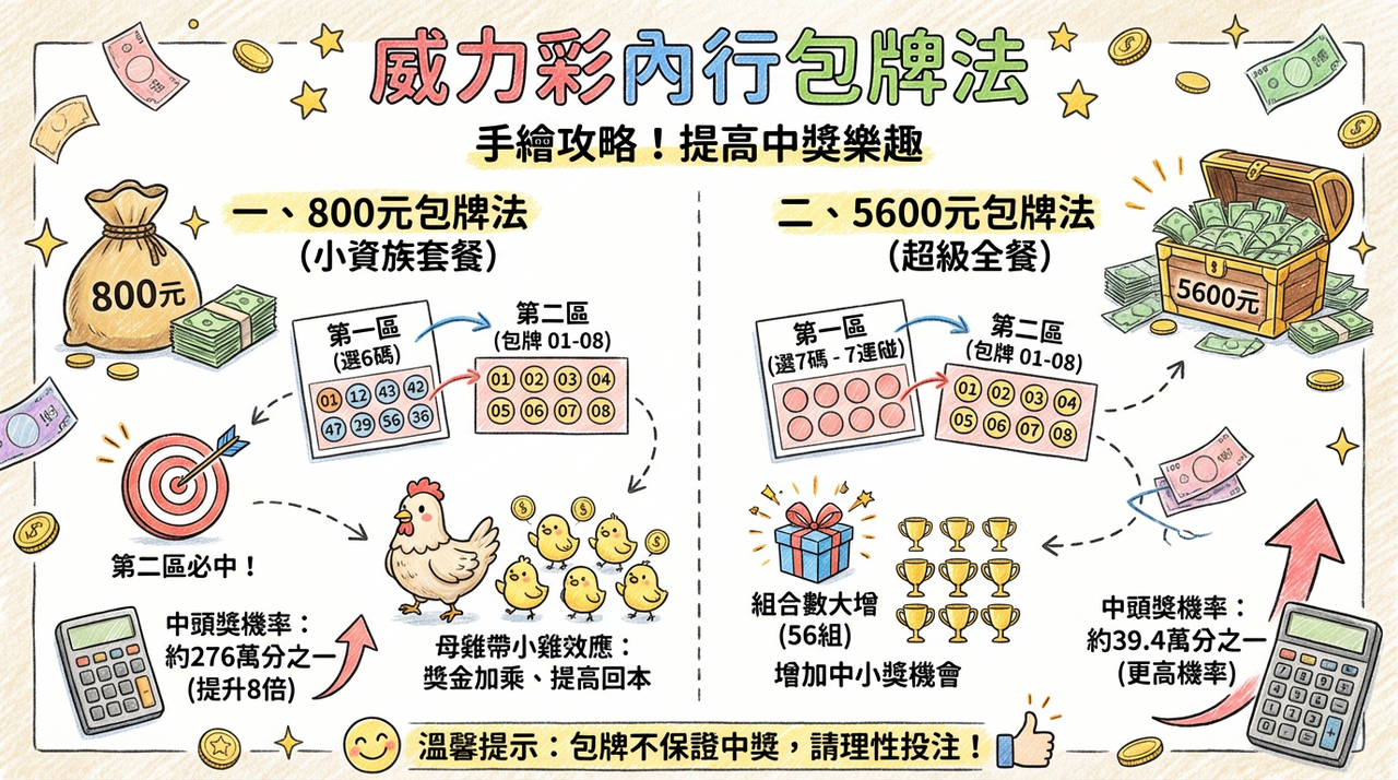 威力彩內行買法來了!威力彩連槓30期後,今晚頭獎上看13.5億元。由於過去不少貳獎得主「沒包牌」痛失頭獎,所以兩大主流「包牌法」一直備受彩迷青睞。為此,《ETtoday新媒體》實際整理包牌攻略,優缺點、集資注意事項、開運偏方一次看。