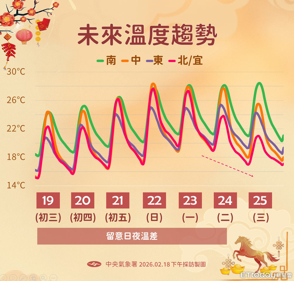 今天大年初二,剛好遇到24節氣中的雨水,冷空氣真的發威了!受大陸冷氣團與東北季風影響,中央氣象署觀測新北石門低溫下探 10.6 度。過年春節走春到底哪區天氣最好?北部降雨機率何時才會降低?出門前務必看懂這篇氣象懶人包,不帶錯衣服、不白撐傘!。初二低溫直逼冷氣團!日夜溫差近13度今天是大年初二,也是 24 節氣中的「雨水」,相信很多人一早都被冷醒。台北測站低溫......